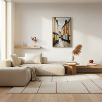 A curved northern street framed by limestone tones and a single ochre facade cutting through the grey sky. Strong vertical composition and textured brushwork create depth and structure without excess.
